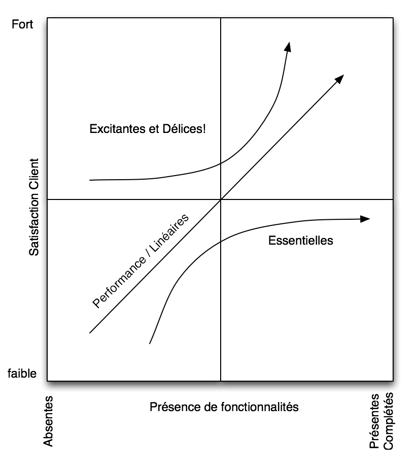 Les fonctionnalités essentielles sont ceux qui doivent absolument être présents afin que le produit réussisse. L’amélioration de la performance ou du nombre de fonctionnalités essentielles a un petit impact sur la satisfaction du client. Par exemple : du moment que le moteur fonctionne et que la voiture marche, peu importe le type du moteur.